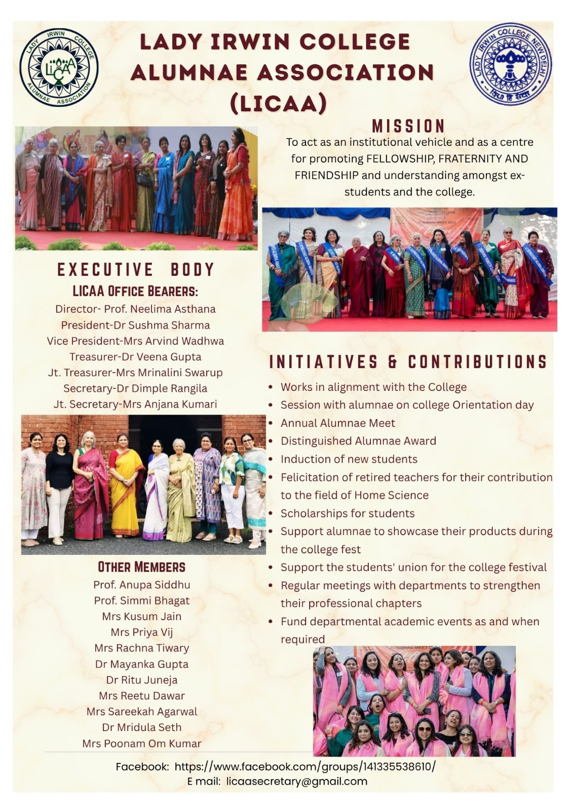 The Lady Irwin College Alumnae Association (LICAA) is an integral continuation of the relationship of a student with their alma mater. LICAA is an active body with many members under its fold. Continuous and consistent attempts are made each year to reach out and connect with as many alumnae as possible. Every year LICAA confers upon one of its illustrious alumna, the Distinguished Alumna Award.